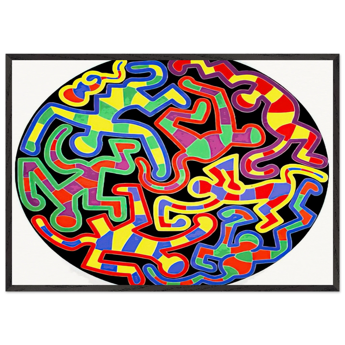 RedKalion presents this archival reproduction as a premium fine art print, meticulously crafted to honor Haring's original vision. Printed on 250 gsm (110 lb) matte, uncoated, natural white archival museum-quality paper—ensuring rich color fidelity and durability—the artwork is protected by shatterproof plexiglass and elegantly framed in a black wooden frame made from responsibly sourced oak and ash wood. The frame measures 20mm (0.79") thick and wide, offering a substantial, gallery-worthy presence that enhances the artwork's impact. This ready-to-hang piece includes a hanging kit, allowing you to elevate your space instantly with a timeless masterpiece that endures.
